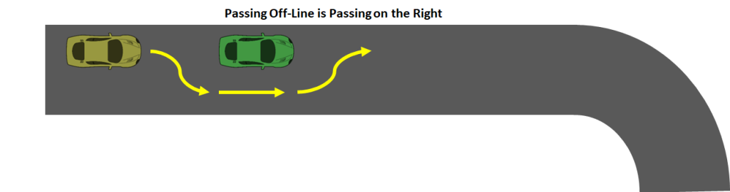 • The turn at the end of the straight can come up fast when you are concentrating on a pass.  Be certain that you have the time to complete the pass and get back on-line, or have the competence to negotiate the turn from the “inside of the corner” if appropriate.