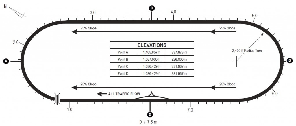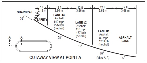 When I left the pits, I took a position in the center lane of the three lanes provided and began my 150 mph run. This lap would also serve to bring my engine and transaxle fluids up to temp, as well as to put some heat into the tires. Although necessary, I was more than happy to move into the left lane for my 190 mph test lap. This lap meant my first use of the high lane on the parabolic curves, where the angle of the pavement varied from 28 to 36 degrees depending on how close to the outer guardrail I wanted to get. The parabolic corners were interesting and different from the counter clock-wise turning Daytona tri-oval that I was used to. Still, even at this speed all the G-forces were down into the seat with almost no lateral load on this clock-wise course.