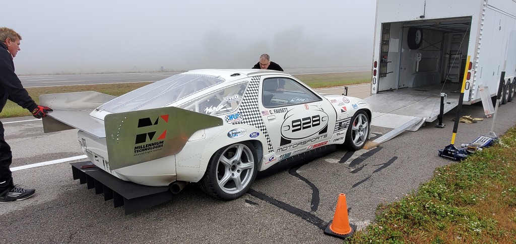 My plan was to take Lap 1 at around the 150 mph mark, to study the course, looking for landmarks for braking zones, corner entry marks, etc. I planned to take Lap 2 at about 190, to feel out the stability of the car and to make sure the aero package was appropriate. After that, I’d go from there. We had a 2:00 PM session planned, with a forecast of 62 degrees and sunny, so that’s when I planned to do my “hero” run. By noon, though, it was 58 degrees and the course was still wet; far from ideal.